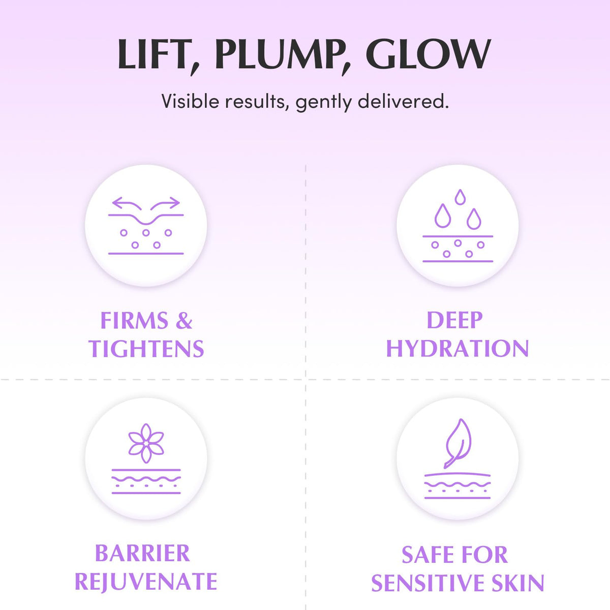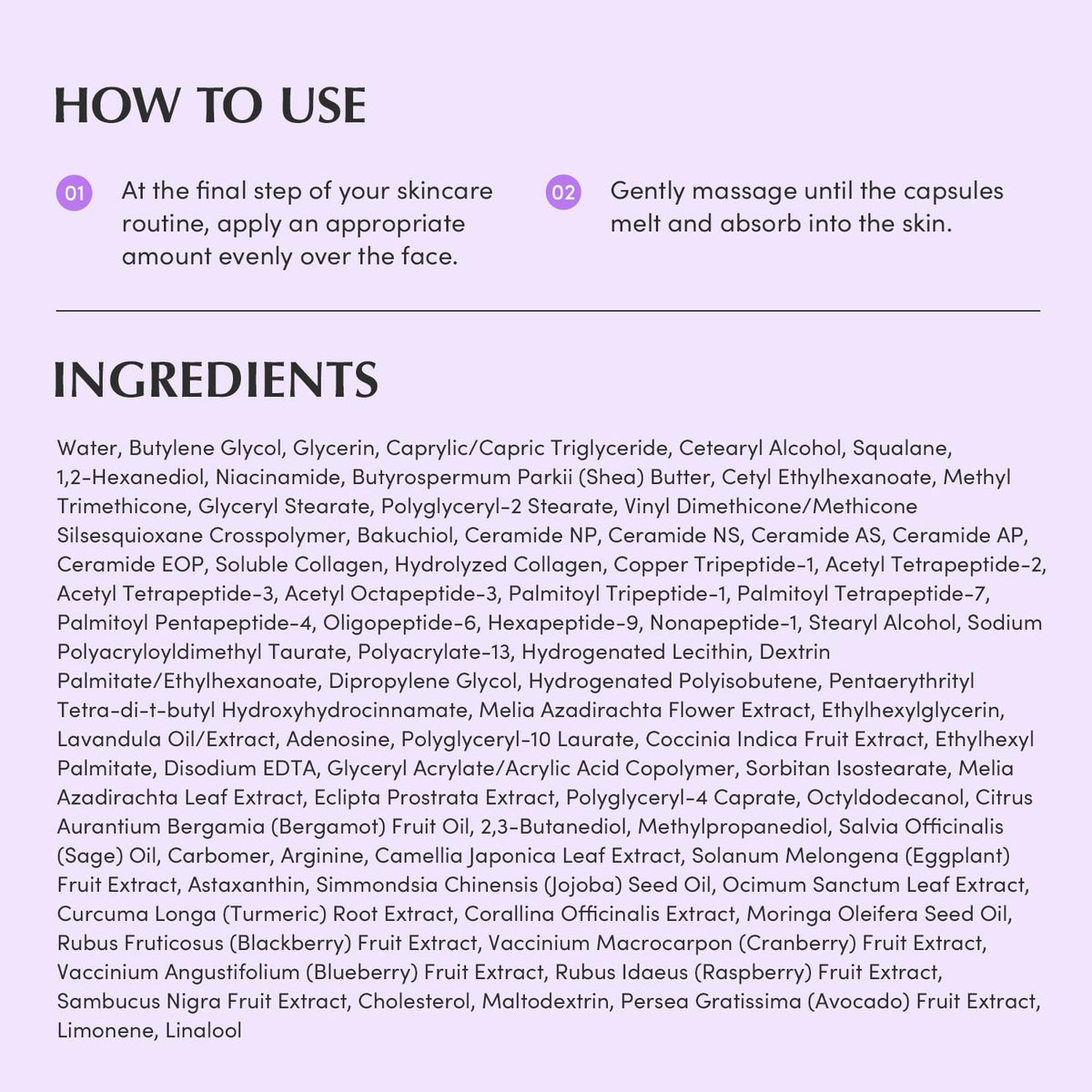 Aqua/Water/Eau, Butylene Glycol, Glycerin, Caprylic/Capric Triglyceride, Cetearyl Alcohol, Squalane, 1,2-Hexanediol, Niacinamide, Butyrospermum Parkii (Shea) Butter, Cetyl Ethylhexanoate, Methyl Trimethicone, Glyceryl Stearate, Polyglyceryl-2 Stearate, Vinyl Dimethicone/Methicone Silsesquioxane Crosspolymer, Bakuchiol, Ceramide NP, Ceramide NS, Ceramide AS, Ceramide AP, Ceramide EOP, Soluble Collagen, Hydrolyzed Collagen, Copper Tripeptide-1, Acetyl Tetrapeptide-2, Acetyl Tetrapeptide-3, Acetyl Octapeptide-3, Palmitoyl Tripeptide-1, Palmitoyl Tetrapeptide-7, Palmitoyl Pentapeptide-4, Oligopeptide-6, Hexapeptide-9, Nonapeptide-1, Stearyl Alcohol, Sodium Polyacryloyldimethyl Taurate, Polyacrylate-13, Hydrogenated Lecithin, Dextrin Palmitate/Ethylhexanoate, Dipropylene Glycol, Hydrogenated Polyisobutene, Pentaerythrityl Tetra-di-t-butyl Hydroxyhydrocinnamate, Melia Azadirachta Flower Extract, Ethylhexylglycerin, Lavandula Oil/Extract, Adenosine, Polyglyceryl-10 Laurate, Coccinia Indica Fruit Extract, Ethylhexyl Palmitate, Disodium EDTA, Glyceryl Acrylate/Acrylic Acid Copolymer, Sorbitan Isostearate, Melia Azadirachta Leaf Extract, Eclipta Prostrata Extract, Polyglyceryl-4 Caprate, Octyldodecanol, Citrus Aurantium Bergamia (Bergamot) Fruit Oil, 2,3-Butanediol, Methylpropanediol, Salvia Officinalis (Sage) Oil, Carbomer, Arginine, Camellia Japonica Leaf Extract, Solanum Melongena (Eggplant) Fruit Extract, Astaxanthin, Simmondsia Chinensis (Jojoba) Seed Oil, Ocimum Sanctum Leaf Extract, Curcuma Longa (Turmeric) Root Extract, Corallina Officinalis Extract, Moringa Oleifera Seed Oil, Rubus Fruticosus (Blackberry) Fruit Extract, Vaccinium Macrocarpon (Cranberry) Fruit Extract, Vaccinium Angustifolium (Blueberry) Fruit Extract, Rubus Idaeus (Raspberry) Fruit Extract, Sambucus Nigra Fruit Extract, Cholesterol, Maltodextrin, Persea Gratissima (Avocado) Fruit Extract, Limonene, Linalool